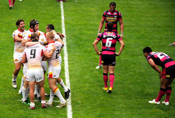 The Catalan Dragons, Perpignan's Rubgy League team, celebrates a try over the Leeds Rhinos on July 10, 2011. The Dragons won the match 38 - 18. Photo by Ariana Bacle