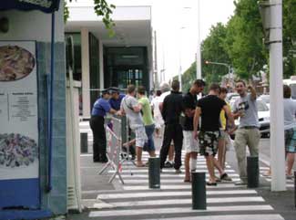 A couple of Surveillance Urbaine officers chat with tourists near a bus stop after a rugby game in Perpignan.