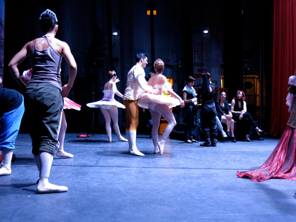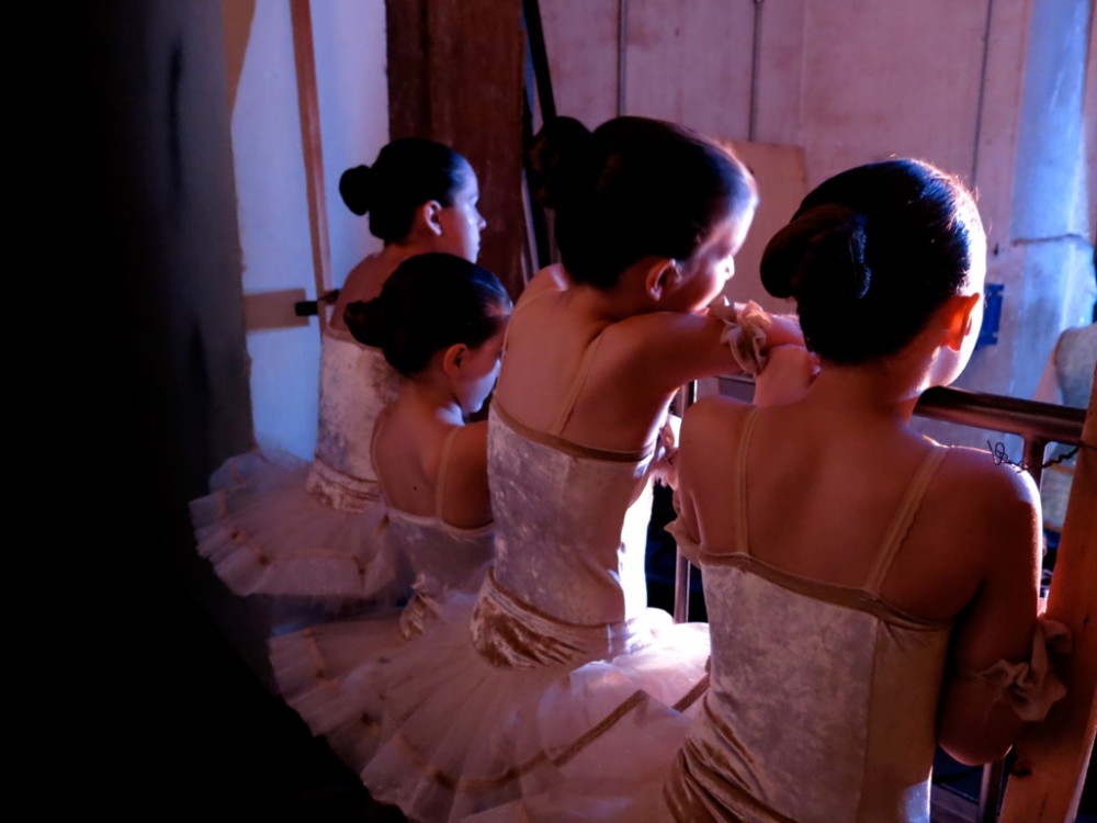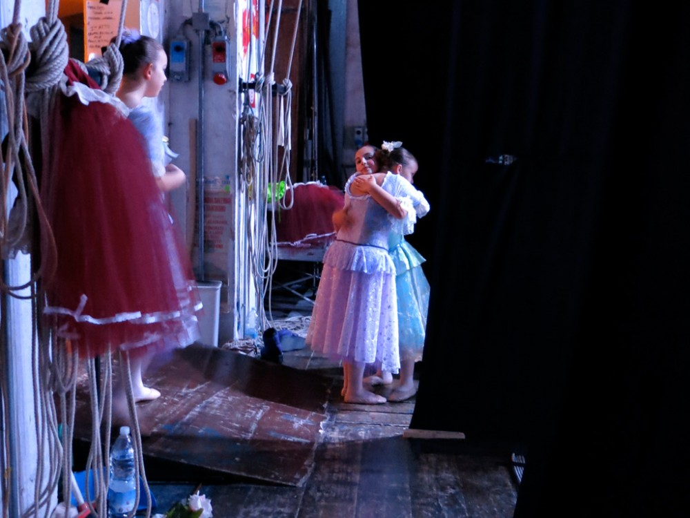 Backstage, the dark floor absorbs and radiates heat from the bright, colorful lights. Younger ballerinas watch the older dancers from the wings, admiring their disciplined and more advanced contemporaries. Dancers prepare for their performance as they laugh, tease, and flirt with one another while stretching and warming up. They eagerly anticipate opening curtain.