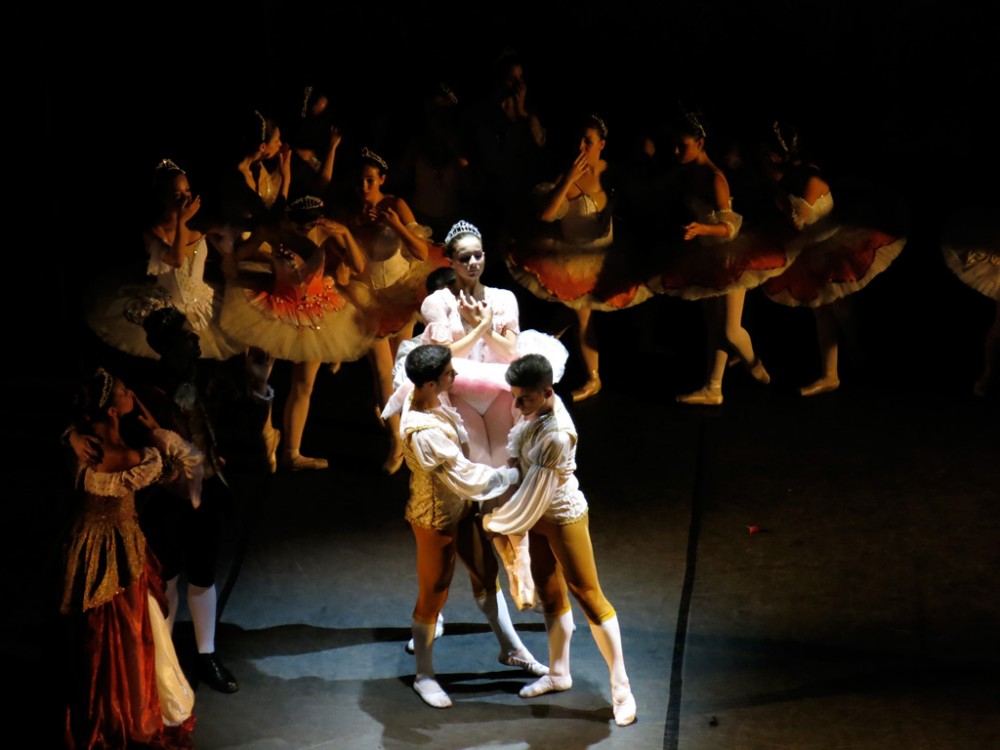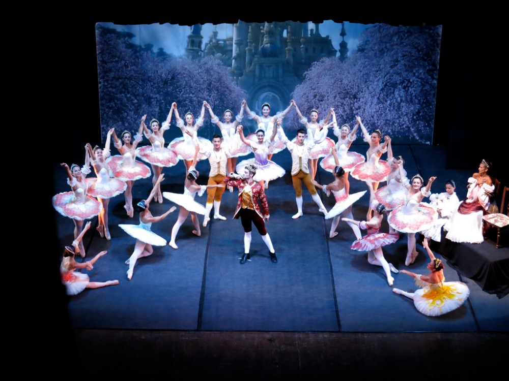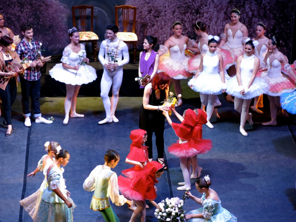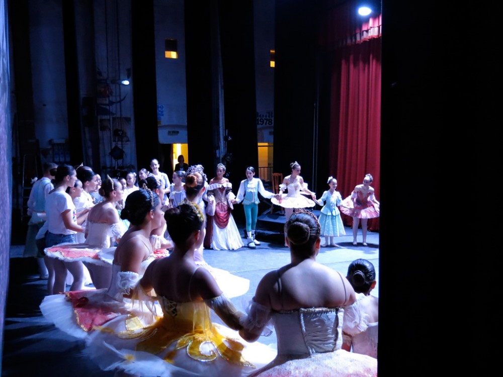 Artistic Director Benilde Marini enters the stage from the wings. The hard sound of toe shoes on the wood floor comes to a halt. In her black dress and high heels, she walks onstage with a graceful gait and impeccable posture that reveal her life spent dancing. The respect these fifty or so students have for their teacher is palpable and shows as they stand straight, pull back their shoulders, and face her attentively. Benilde smiles in approval and summons her dancers to join together with her in a big circle. Holding hands and in unison, she leads while they enthusiastically whisper a ceremonial cheer akin to wishing each other a fantastic and successful performance, signifying that the tough work of rehearsals and preparation is done; it is now time to perform. The audience has no idea of the private ritual happening behind closed curtains a mere ten feet away from the first row.