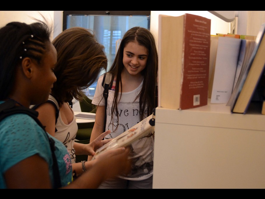 Teens also come to the library in search of a little fun. Perky Sophia Scarpellini brings her out-of-town friends to the center. The animated trio hopes to find summer entertainment in the form of young adult movies and books. She says they are looking for “fierce love” stories. They like to read adventure stories like Aragon, The Hunger Games, and the Twilight books. Sophia appreciates the Center for more than its amusing books and videos. “The library is quiet for studying,” says Sophia, “and, it’s free!”