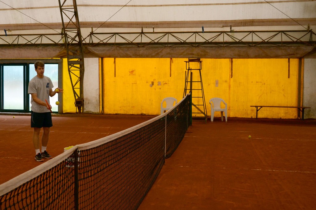 Luca prides himself on the new clubhouse. The building matches the red clay of the indoor court. In the bar, old racquets hang on the walls beside posters of upcoming tournaments. Players gather on the plaid couch by the beer cooler or outdoor picnic table. White and beige tiles cover the walls of the new bathrooms above wooden benches and spotless showers.