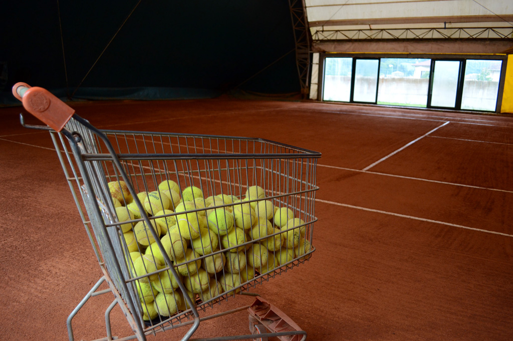 Luca says the clay court is the most popular surface for his members. Red bricks are crushed into a fine powder that coats the court. Outside the covered court complex, three pallets are stacked with dozens of 55-pound bags of the red silt. Kicking up dust, players slide across the loose particles, and balls bounce wildly during rallies. Luca or one of the players will drag a wide rake over the court to even the clay that is swirled about after hours of play. He wipes away the skids from shots that caress the white lines, barely landing “in” to push opponents out wide.
