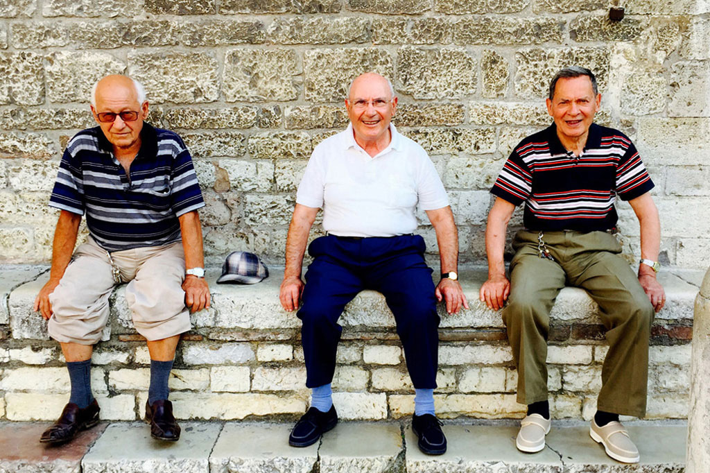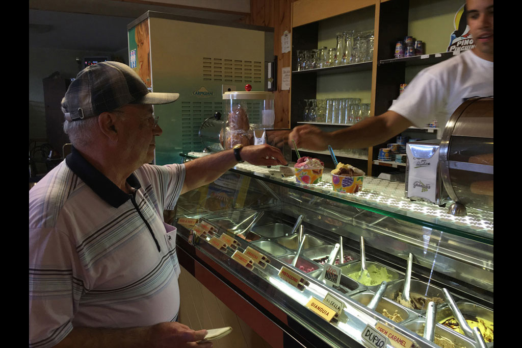 When he and his friends at the wall say goodbye for the day, Giuseppe walks through town with his car keys jingling on a hook at his waist and his gum-soled shoes keeping him firmly grounded. He moves from street to street, buying groceries and chatting with friends along the way in all the stores he frequents.