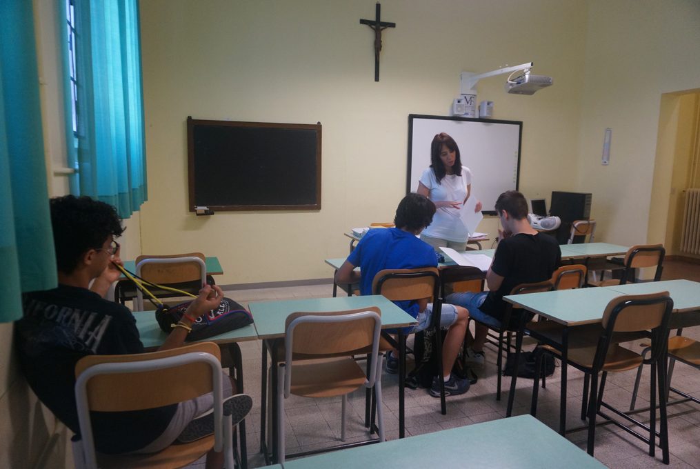 On the agenda for the day was first, second, and third conditional grammar. Like a proud mother, she patiently waited while one of the boys read aloud or answered a question in English. When the time came to complete the class, the three boys and Giuditta reviewed the lesson. “Very good,” she said smiling, and the boys were dismissed.