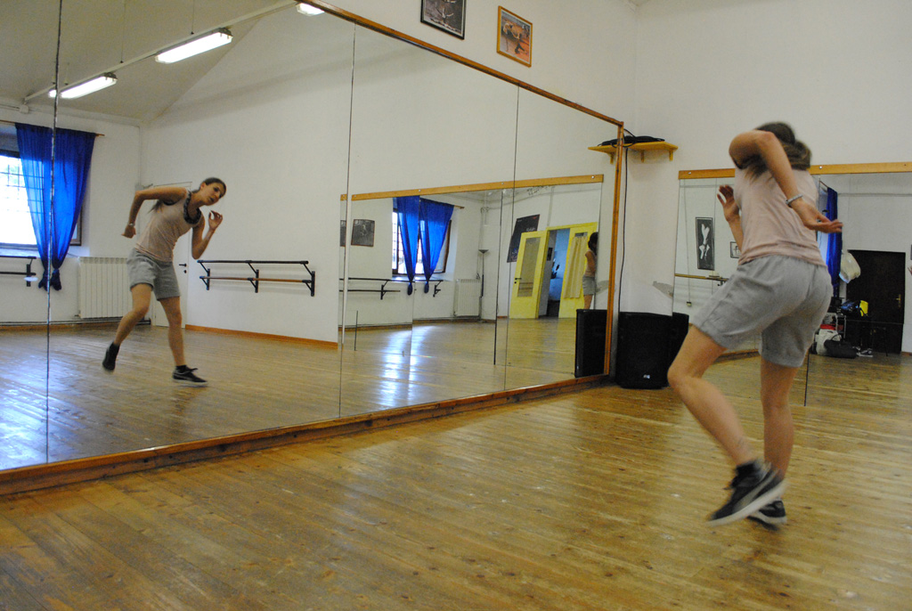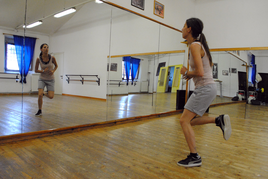As the first song continues, Roberta creates a seamless mix of steps: B-Boy, Wu-Tang, Pop Lock and Droppin It, as well as an endless assortment of unrecognizable moves. She seems to challenge her reflection with each move as if she were engaged in her own personal dance battle. Roberta blends sharp movements with fluid ones to create a hip-hop dance routine fit for a dance studio in the street-style metropolitan areas of Los Angeles or New York City; yet here she is in Cagli—a small town in the Marche region of Italy.