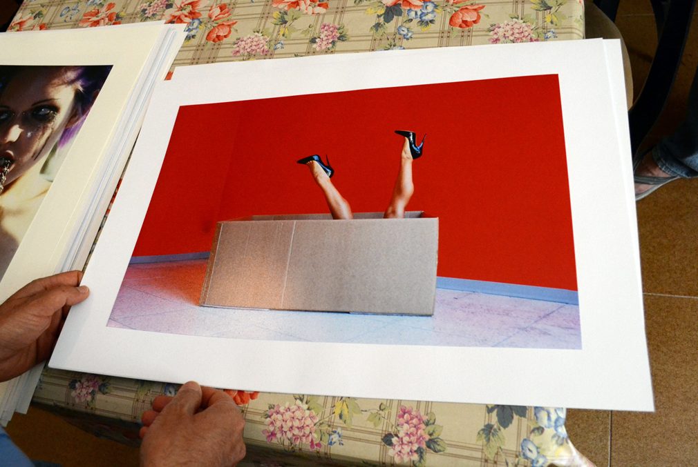 He points to a particular photograph displaying a woman in a cardboard box; only her legs show. She wears black stilettos. Flory explains that the box was the only prop he had, so he improvised. The shot looks planned rather than one born of circumstance. He captured the stunning beauty of her legs in a simple, flirty fashion.