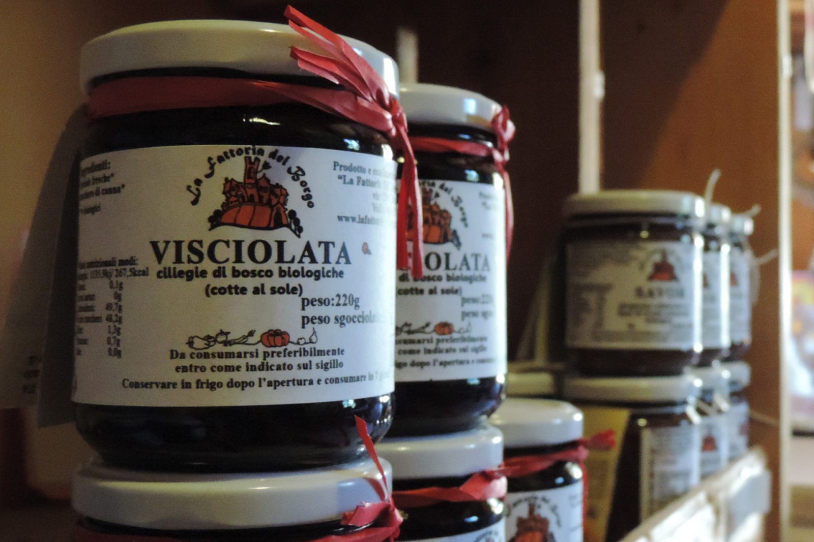 Cherries are just one kind of many kinds of produce grown on the farm. There are also apricots, tomatoes, olives, elder flowers, sage, lavender, and rosemary. Libanore is equally proud of the many products he makes from those raw ingredients. These include Sapa (a thick liquid to pour over ricotta polenta and ice cream, made from crushed grapes), Visciolata (a dessert topping, made from forest cherries left in the sun for 60 days), Il Riparaguai (“the repairman,” a cherry-based Sangiovese wine drink), and Sciroppo di Fiori di Sambuco (a healthful drink containing elder flowers, lemon, and cane sugar).