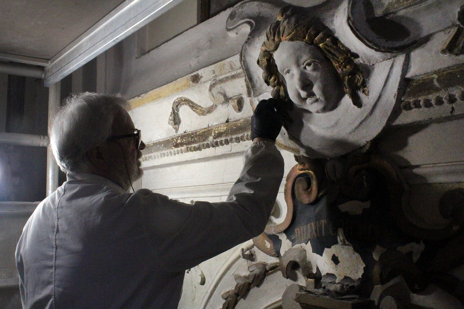 Isidoro, the father, uses a scalpel to chip relentlessly at the paint, which can be five or six layers thick. He is white-haired, bearded, and bespectacled, and wears a long white lab coat. His son, Matteo, is dressed more casually, his brown hair and beard contrasting with his father’s features. He takes a cotton swab soaked in solvent, and carefully swipes it along the curve of a decorative border to reveal a flash of gold from underneath. It’s quiet, focused work, disturbed only by the scratch of scalpels and faint rustling of paint chips falling to the floor below.