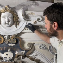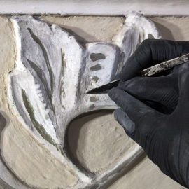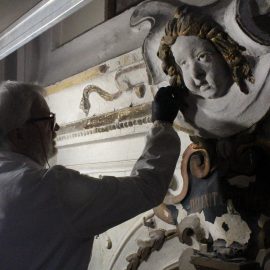 Matteo laughs, gesturing at the contrasting textures. “In short, this,” he points at the unrestored part, “is ugly.” He delicately brushes some plaster dust off a freshly cleaned scroll on the statue, and taps it with the tool. “And this is beautiful.”