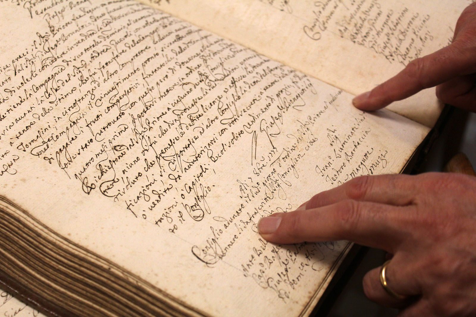 In the humble adjoining office, Giuseppe Cucco, the head, or prior, of the confraternity, sits and sifts through the church archives. The shelves behind him hold boxes upon boxes of scrolls, parchments, and old leather-bound tomes, some of which date back to the 1200s. He flips through them slowly, carefully, running fingers over the looping script and ink blotches, digesting everything, however trivial. Sometimes, he stops and crinkles his salt-and-pepper eyebrows. It can take Cucco up to thirty minutes to decipher a single word, but he always forges on.